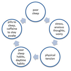 CBT is aimed at breaking the cycle of insomnia. Poor sleep tends to lead to stress and anxious thoughts about not being able to sleep. This in turn leads to stress and tension, which leads to poor sleeping habits, such as the use of sleeping pills. This leads to worsening insomnia and so on.